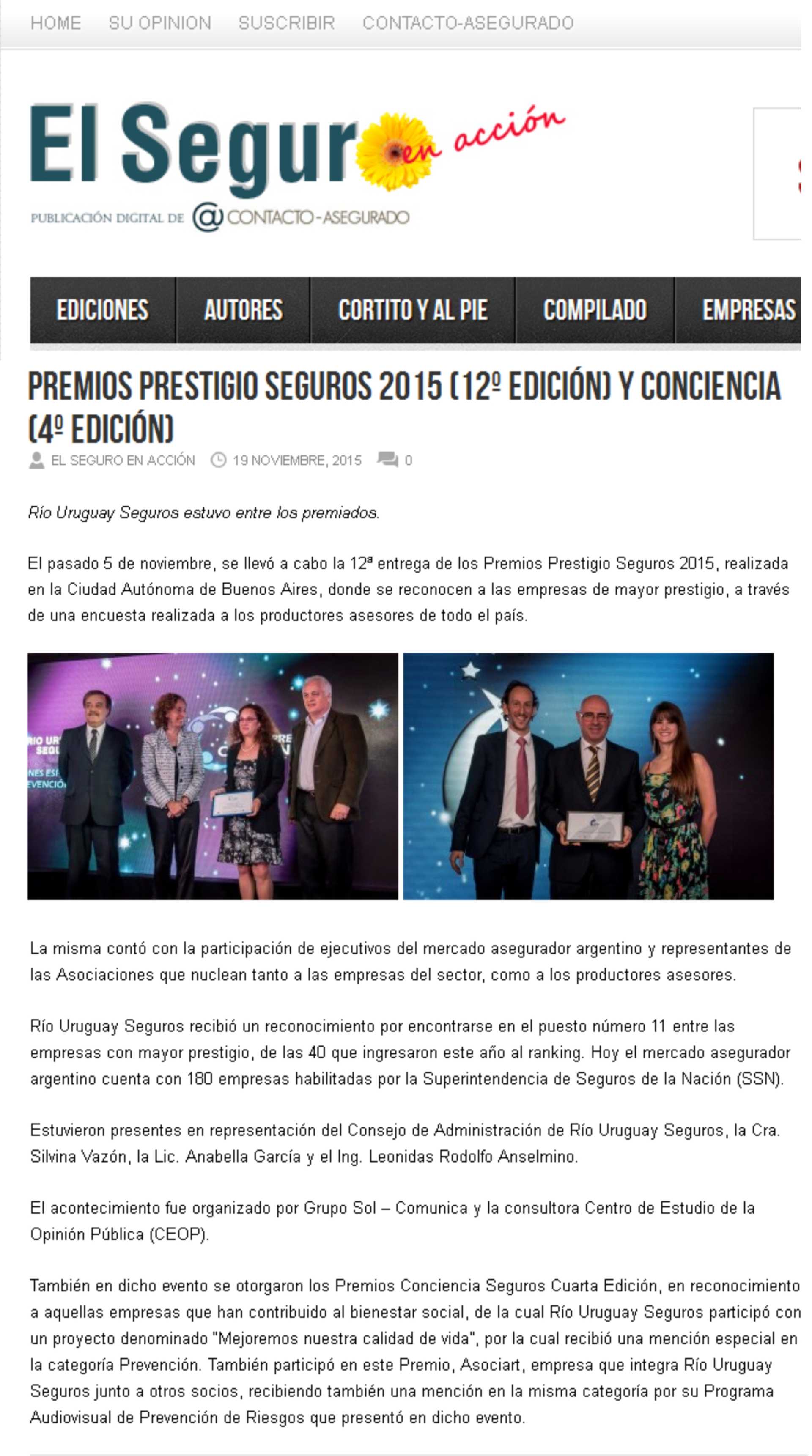 El sitio en Internet Tiempo de Seguros publicó en su portada del lunes 23 de noviembre de 2015, una nota destacando el reconocimiento a Río Uruguay […]