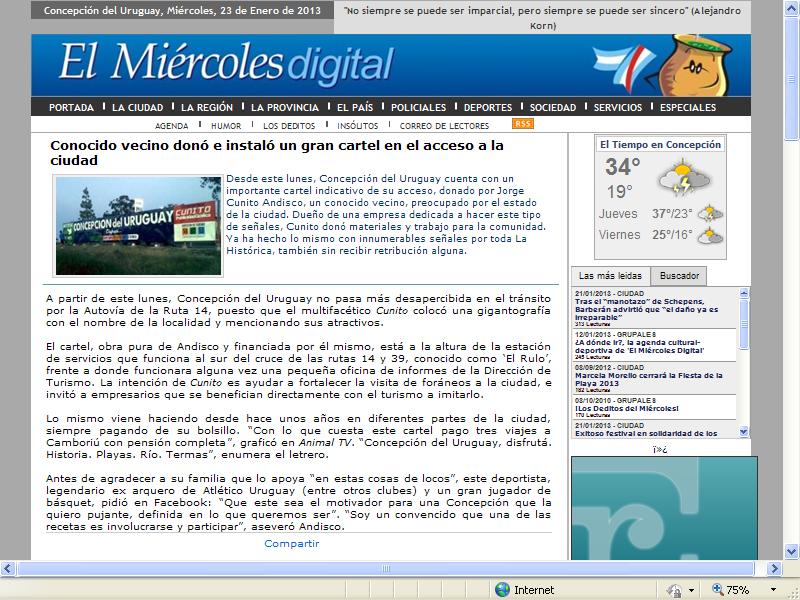 (f) Nuestro compañero, Jorge Mario «Cunito» Andisco, continúa realizando tareas en pro de la comunidad de la que es parte. Acorde a su tarea -extra RUS- ha dispuesto cartelería indicativa de la entrada de la ciudad de Concepción del Uruguay. Los diferentes medios locales se hicieron eco ponderando su actitud. En la imagen el artículo de El Miércoles Digital.