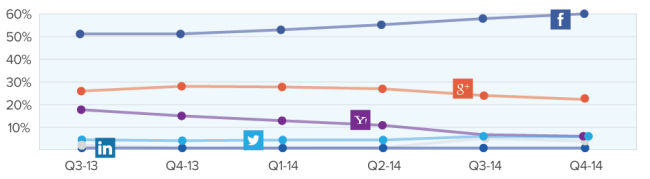 Facebook mantiene su trono como la red social que más ingresos de usuarios tiene según un informe presentado por Gigya. Además, expandió su dominio en el último cuarto del 2014 llegando al del 61%, tres puntos más que la última revisión y diez más que al comienzo del año.