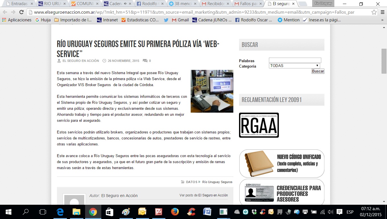 En el newsletter que distribuye El Seguro en Acción (El Seguro en accion [noresponder@contacto-asegurado.com]) se refleja RIO URUGUAY SEGUROS y la emisión de la primera póliza […]