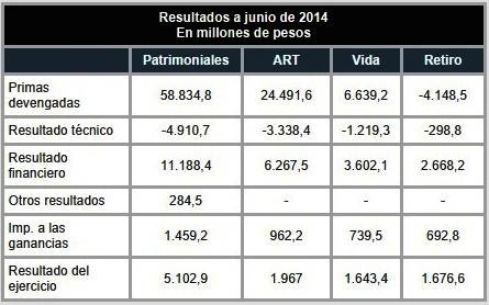 A continuación se publican los resultados del mercado asegurador argentino correspondientes al último ejercicio (julio de 2013 a junio de 2014), clasificados en seguros patrimoniales, riesgos del trabajo y personas.