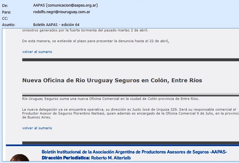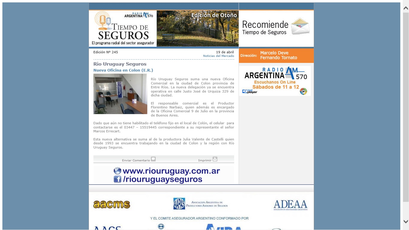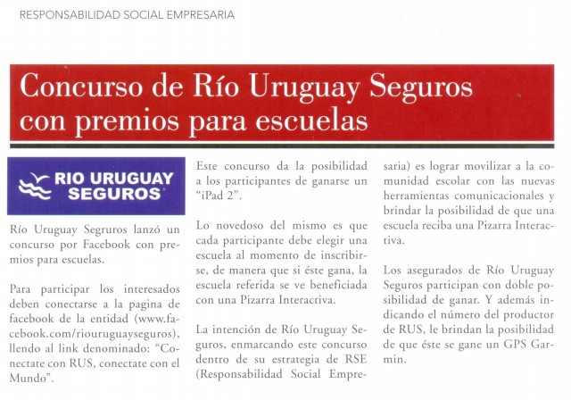 (f) En el Newsletter especializado Tiempo de Seguros [info@tiempodeseguros.com.ar] nro. 245 del 19/4/13 se publica esta nota sobre RIO URUGUAY SEGUROS.