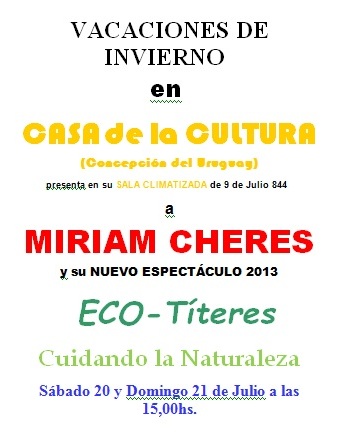 (f) …presenta en su SALA CLIMATIZADA de 9 de Julio 844 (Concepción del Uruguay) a MIRIAM CHERES y su NUEVO ESPECTÁCULO 2013 ECO-Títeres Cuidando la Naturaleza. […]