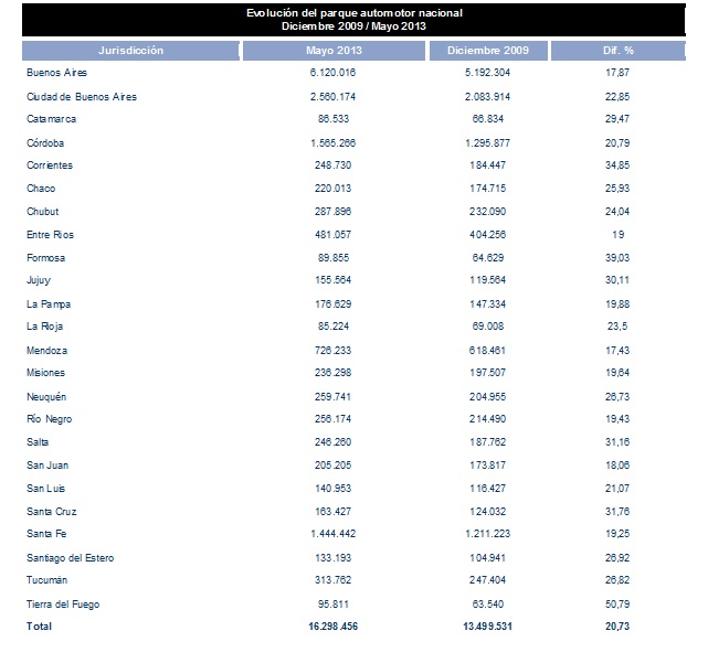 (f) El parque automotor argentino se incrementó un 20,7% entre diciembre de 2009 y mayo de 2013, pasando de 13.499.531 unidades a 16.298.456 vehículos entre las […]
