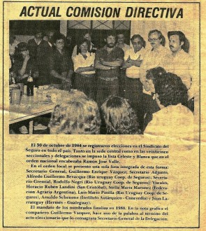 (f) SINDICATO DEL SEGURO. Con el retorno a la democracia en la Argentina en 1983, las instituciones comenzaron a normalizarse y una de ellas fue el Sindicato del Seguro. En la Delegación de Concepción del Uruguay (que entonces existía de esa manera) hubo elecciones para elegir la conducción local. Se salía de la época mas oscura de la historia argentina, pero los empleados de RUS aportaron su cuota con su participación y compromiso. Con mas del 95% de los votos triunfo la lista Azul y Blanca, que revalidaría nuevamente en 1988 con mas del 90%. Esta nota -aparecida en el diario La Calle- refleja el histórico momento en el que se instituye la democracia gremial en la casa de los trabajadores de nuestra actividad en Concepción del Uruguay. Imborrable.