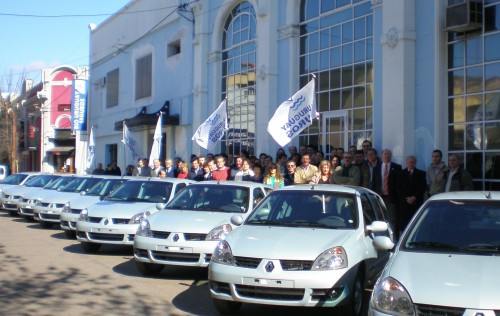 (f) Nueva flota 2007. En el año 2007 RIO URUGUAY SEGUROS renovó parte de su flota automotor con la adquisición de flamantes Renault Clio. En la imagen la llegada de los vehículos frente a la Casa Central y algunos de los integrantes de su personal apreciando los nuevos móviles.