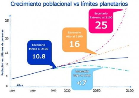 La Unidad de Crecimiento Poblacional de las Naciones Unidas ha construido un análisis con cinco escenarios posibles sobre el crecimiento de la población con una proyección al año 2100. La línea continua azul muestra el crecimiento poblacional actual hasta el 2010, con 7.200 millones de personas. Las otras cuatro líneas muestran las distintas proyecciones de escenarios dependiendo de cómo varíe el grado de fertilidad de los habitantes del planeta para el final del siglo 21. Pequeños cambios en la trayectoria de la tasa de fertilidad en las próximas décadas producirán grandes consecuencias sobre el planeta y sus habitantes.
