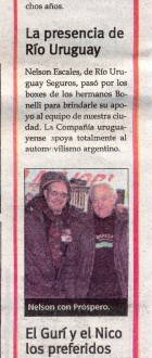 (f) Este fin de semana pasado se corrió una nueva fecha del TC. En la oportunidad uno de los funcionarios de RUS que concurrió al evento -que tiene como sponsor a RIO URUGUAY SEGUROS- fue nuestro compañero Nelson Maximiliano Escales. El diario La Calle de Concepción del Uruguay se hace eco de su presencia, junto al ex destacado piloto de la Formula Entrerriana, Próspero César Bonelli (padre de los actuales corredores Próspero y Nicolás Bonelli). ¡Grande Nelson..!