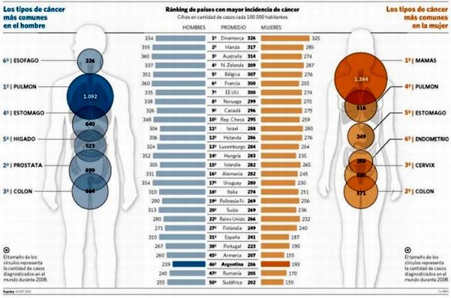 Para los hombres, el cáncer que más muertes provoca es el de próstata, seguido de los de pulmón, estómago y colon, mientras que entre las mujeres el que más fallecimientos causa es el de mama, estómago, pulmón, cuello de útero y de colon.