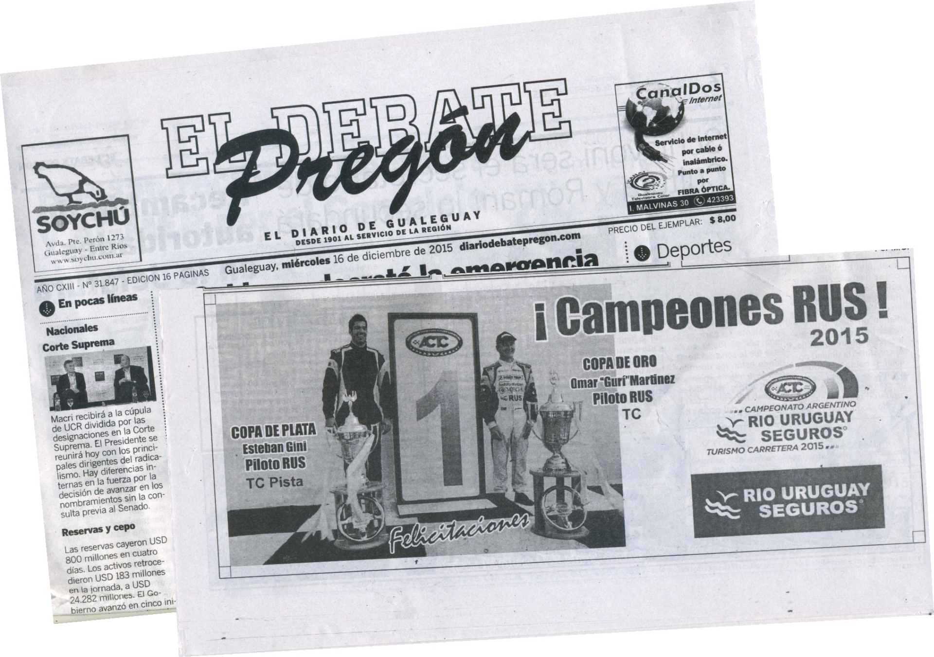 El Diario de Gualeguay Entre Ríos publicó en su edición papel del día miércoles 16 de diciembre de 2016, un aviso con la felicitación de Río Uruguay Seguros a los pilotos Omar «Gurí» Martínez (Campeón 2015 del TC) y Esteban Gini (Campeón 2015 del TC Pista).