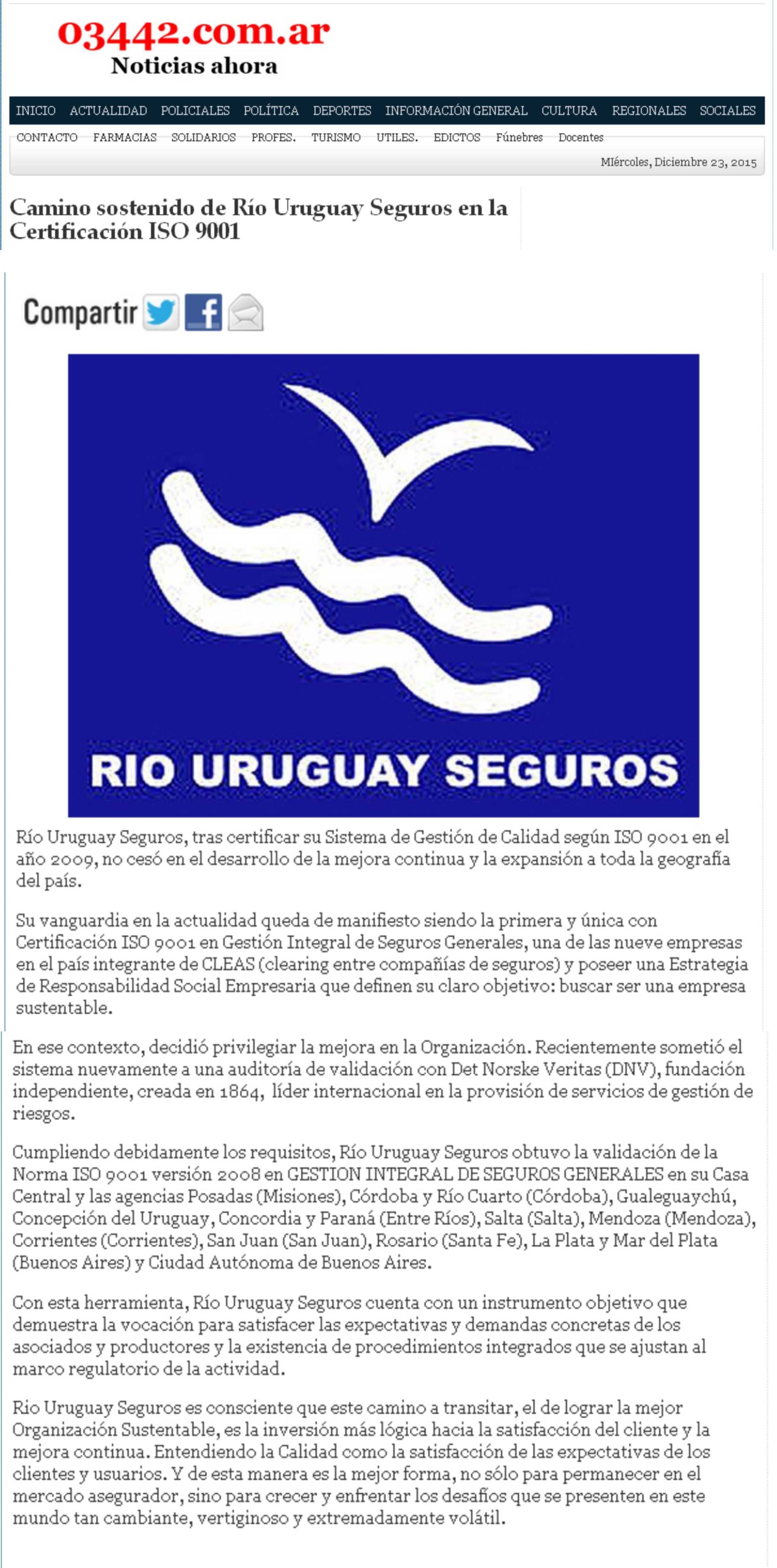 La página Web http://03442.com.ar publico en su portada del día miércoles 23 de diciembre de 2015, una nota destacando a Río Uruguay Seguros quien Certifico su Sistema de Gestión de Calidad ISO 9001.