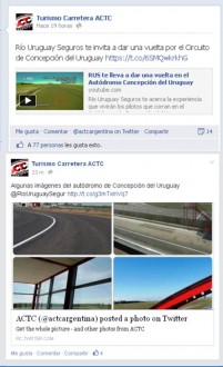 (f) El Sitio Oficial de la ACTC en facebook publico el video generado por el Proceso de Comunicaciones de RUS, “RUS te lleva a dar una vuelta virtual por el Autódromo Concepción del Uruguay”.