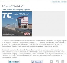 (f) En el Newsletter Tiempo de Seguros del 25/4/14 Edición Nº 298, se refleja -mencionando a RUS- los próximos pasos, “calentando los motores”, en la previa a Gran Premio RIO URUGUAY SEGUROS de TC que se llevará a cabo en el curso del mes que viene, inaugurando el Autódromo de Concepción del Uruguay.