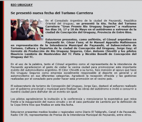 (f) en la página Web especializada en Seguros 100Seguro.com.ar, se refleja la actividad de RUS promocionando el Gran Premio RIO URUGUAY SEGUROS en Paysandú (República Oriental del Uruguay) que se disputará este fin de semana, cuando se inaugure el Autódromo de Concepción del Uruguay.