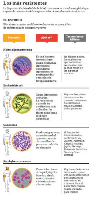 «También ya se registran niveles muy altos de resistencia del neumococo [muy frecuente en infecciones respiratorias graves]; hay datos alarmantes sobre las Neisserias, entre las que se encuentra el gonococo [causante de enfermedades de transmisión sexual, el antibiótico que se utilizaba hasta hace pocos años, la ciprofloxacina pasó del 2 a casi el 35% de resistencia en diez años], y altísima resistencia al estafilococo dorado [que puede causar infecciones cutáneas y de las mucosas, forunculosis o conjuntivitis, abscesos profundos, osteomielitis, meningitis, sepsis y otras enfermedades graves]», agrega el doctor Gustavo Lopardo, presidente de la Sociedad Argentina de Infectología.