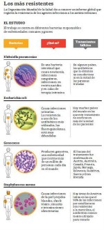 La Organización Mundial de la Salud acaba de dar a conocer el primer informe global sobre resistencia a los antibióticos, realizado en 114 países. Advierte que el fenómeno se registra en todas las regiones, y que las consecuencias de esta situación podrían ser «devastadoras». Entre otros datos inquietantes, menciona que en ciertos países dos antibióticos ya no funcionan en más de la mitad de las personas tratadas. Uno de ellos es el carbapenem, considerado el último recurso en infecciones graves.